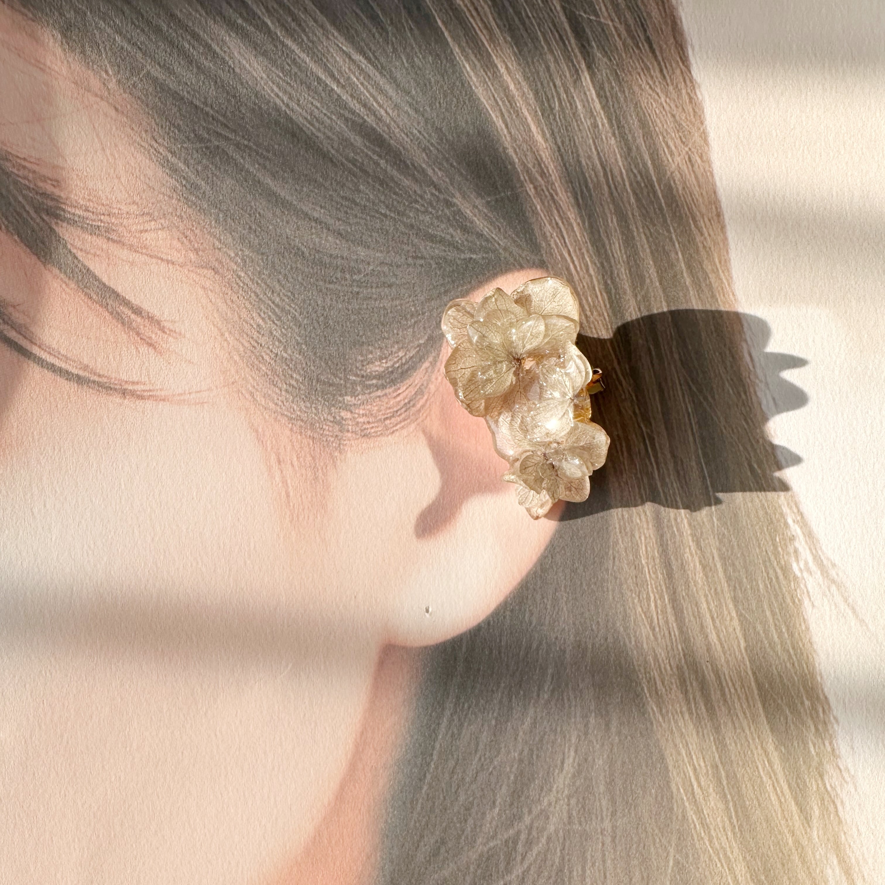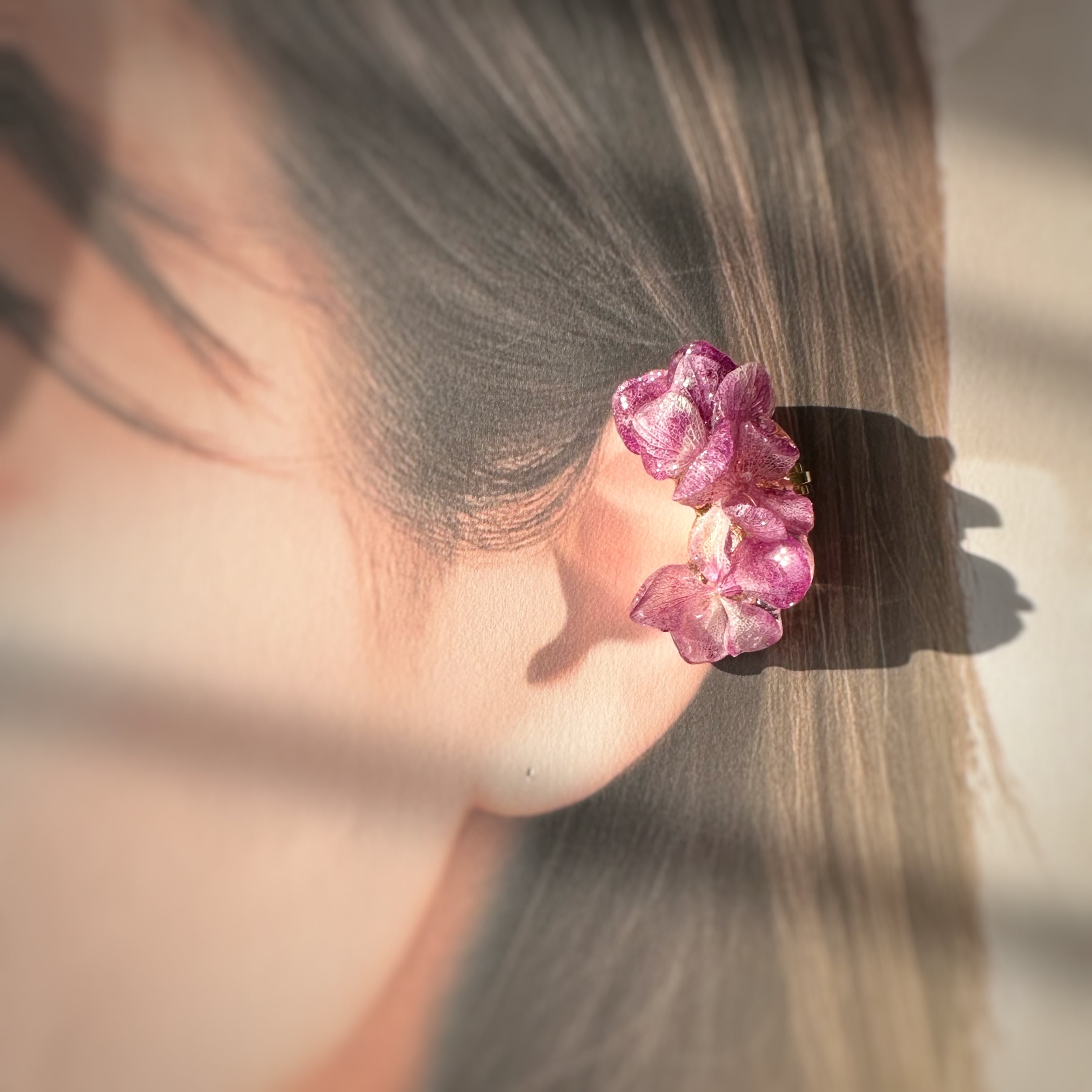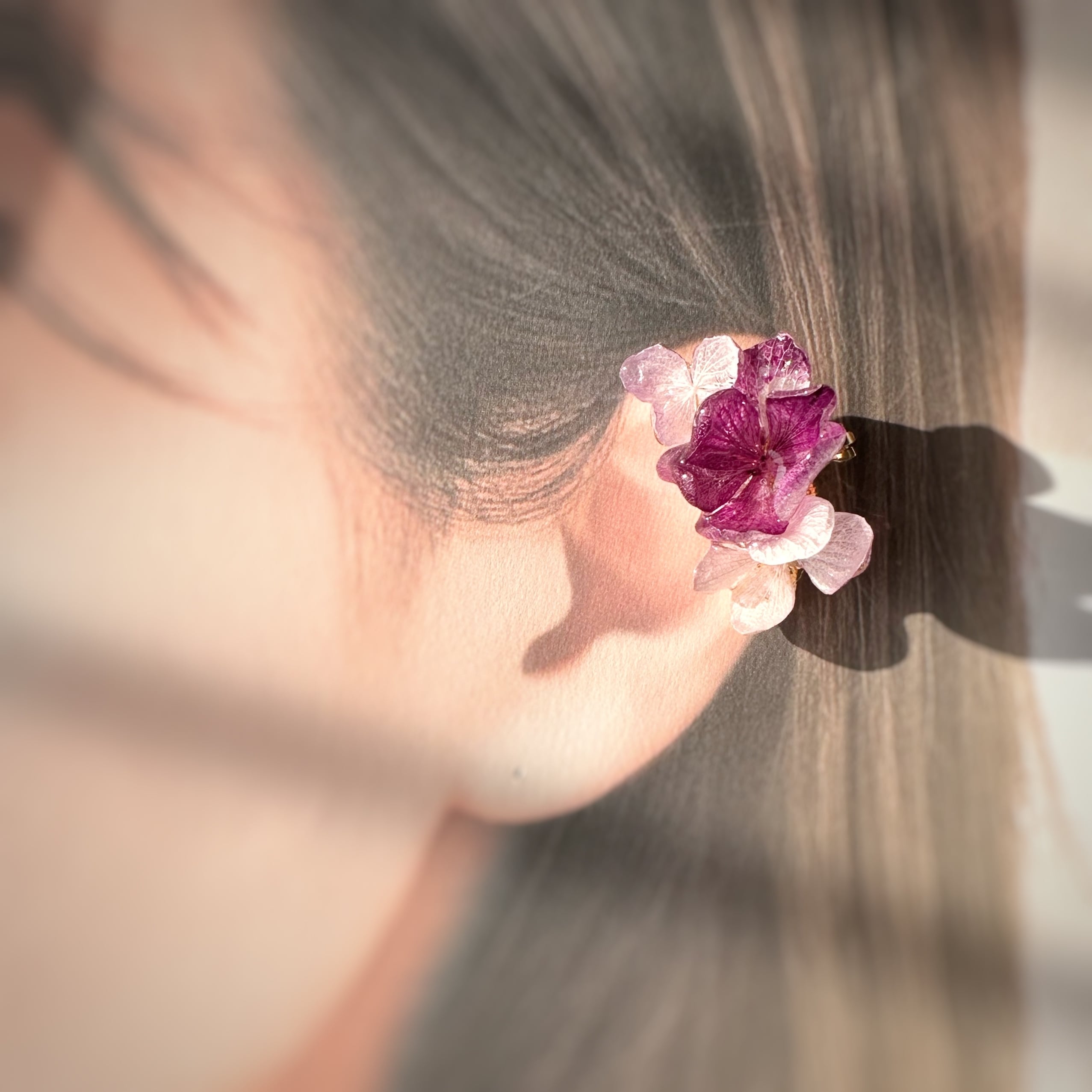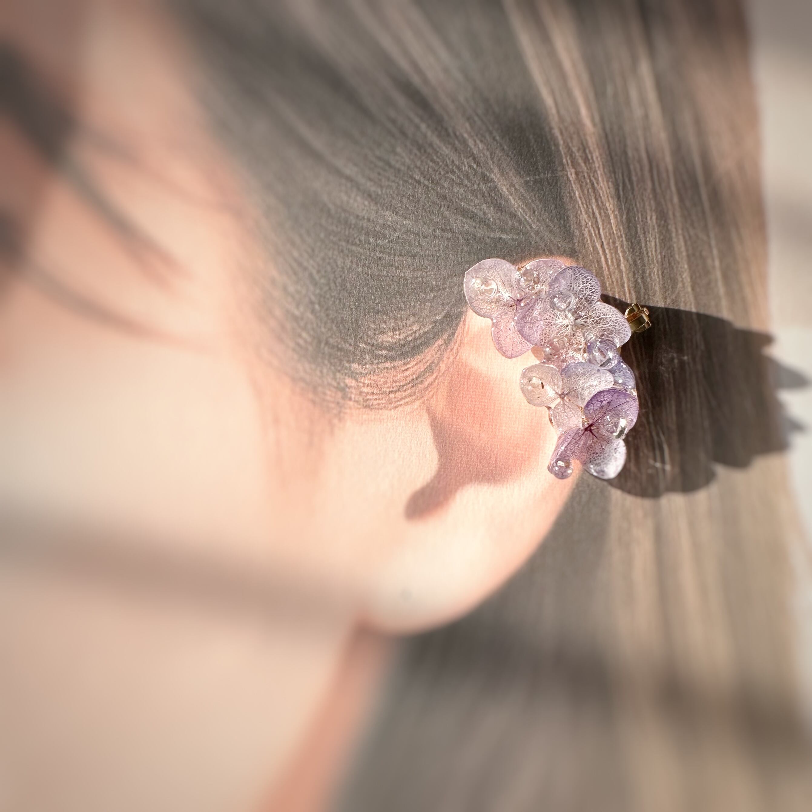 本物の紫陽花の花びらプリザーブドフラワー、レジン、イヤーカフ、透かしパーツ