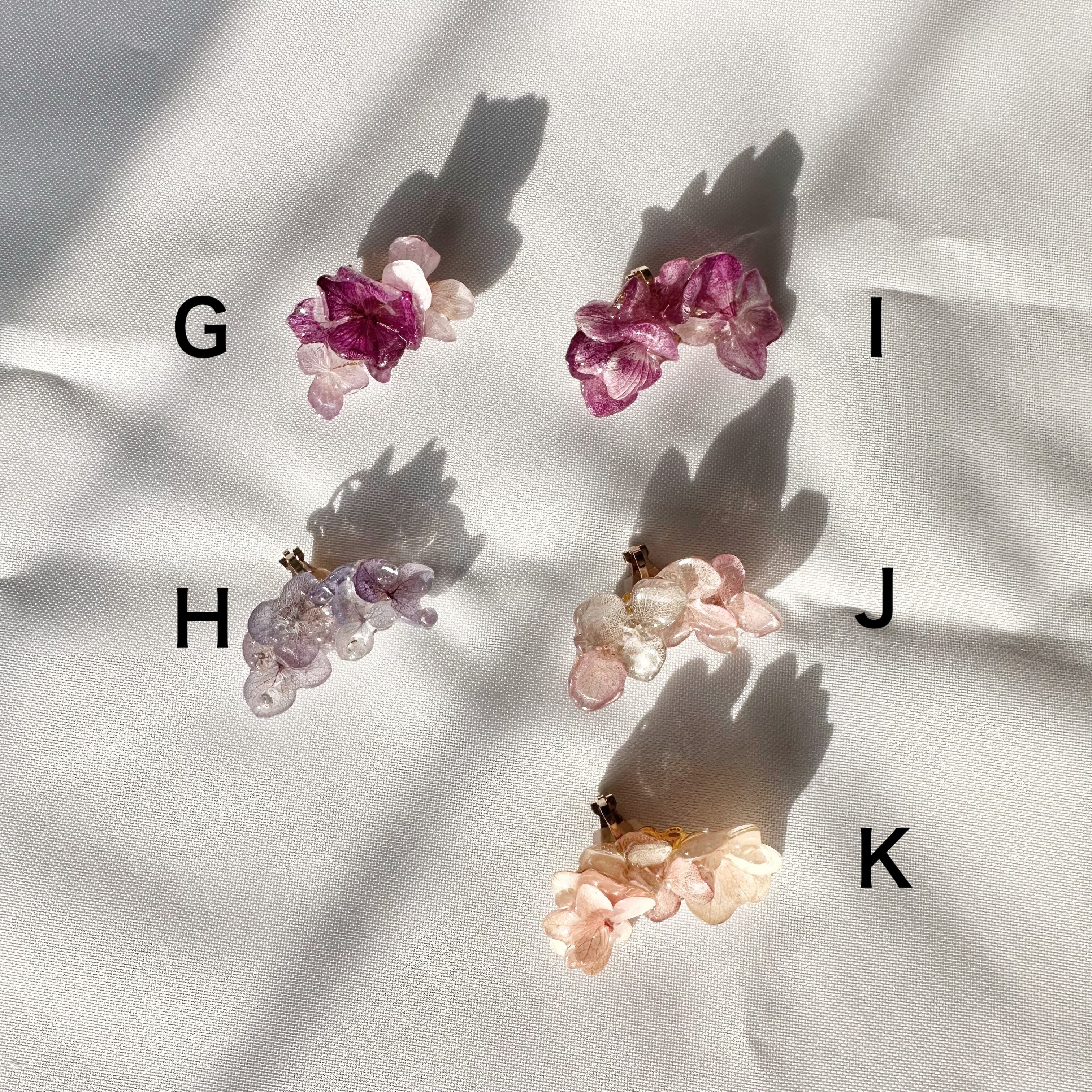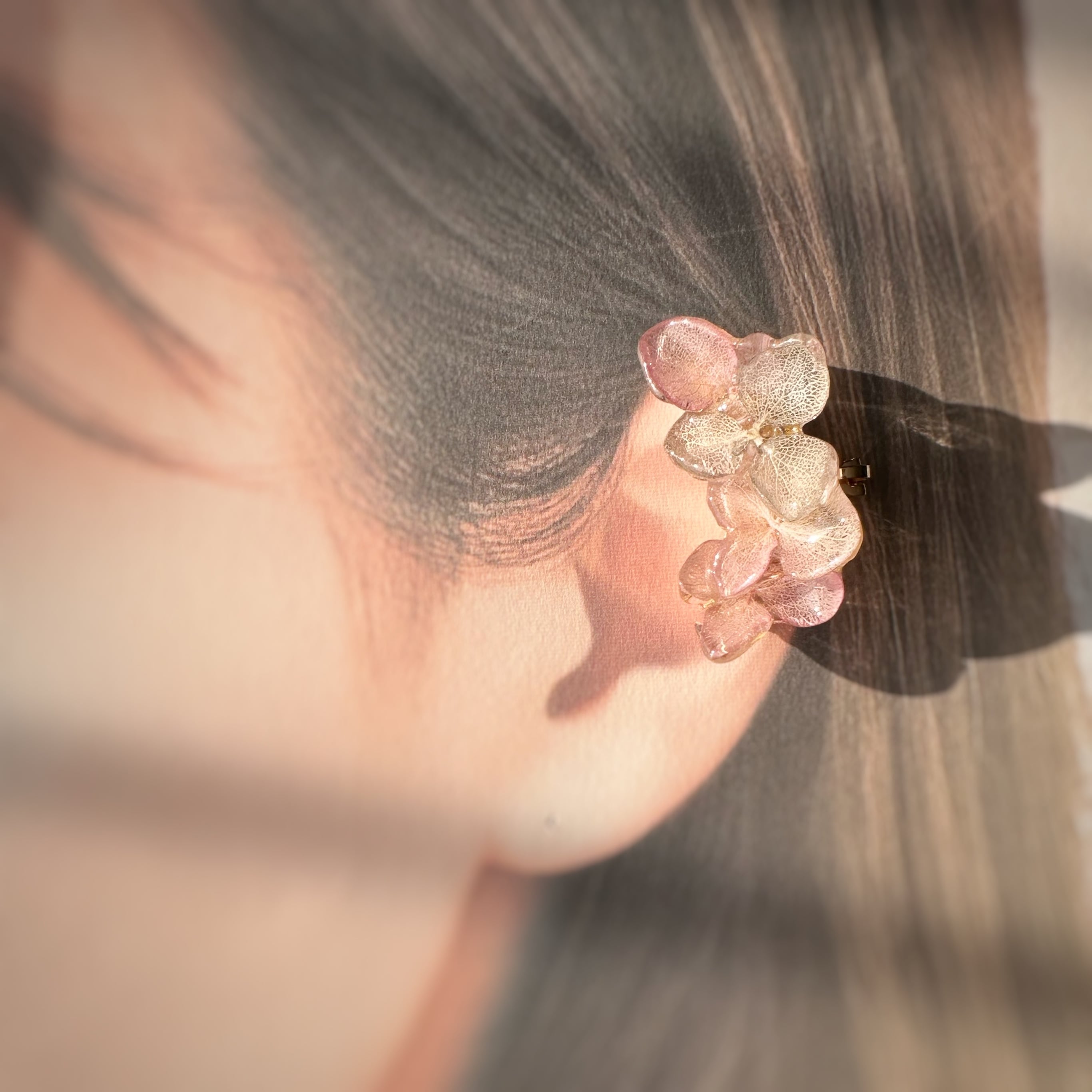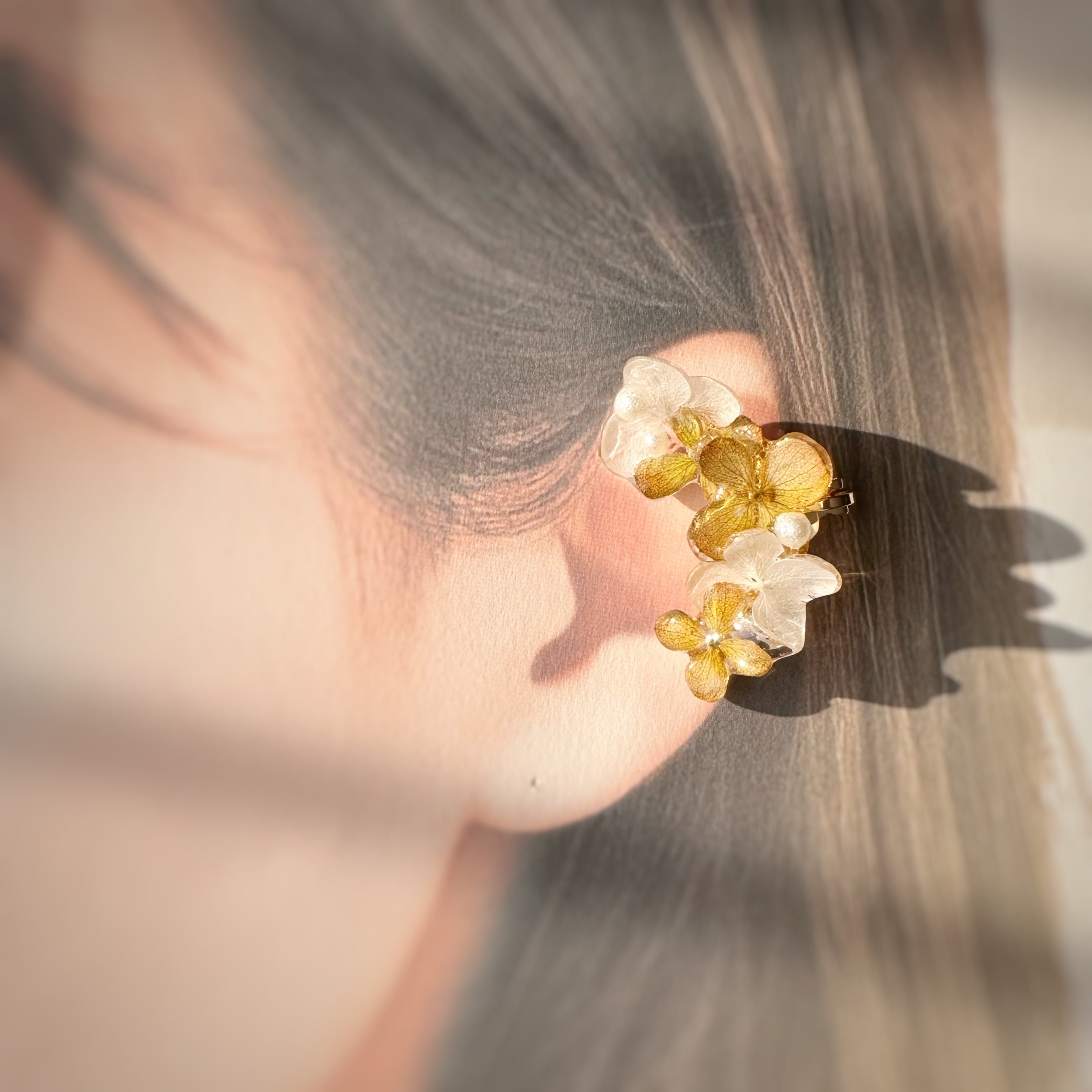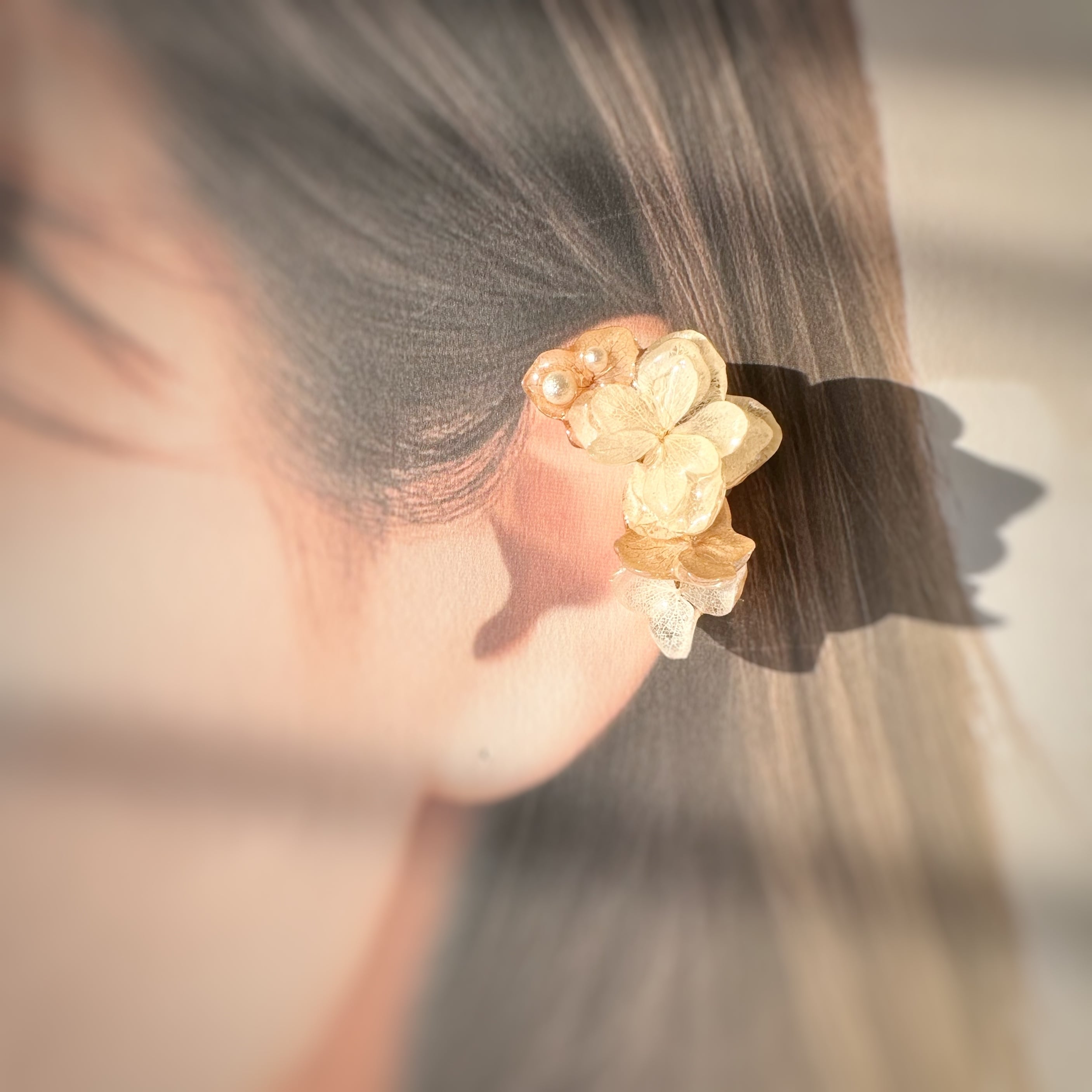 本物の紫陽花の花びらプリザーブドフラワー、レジン、イヤーカフ、透かしパーツ