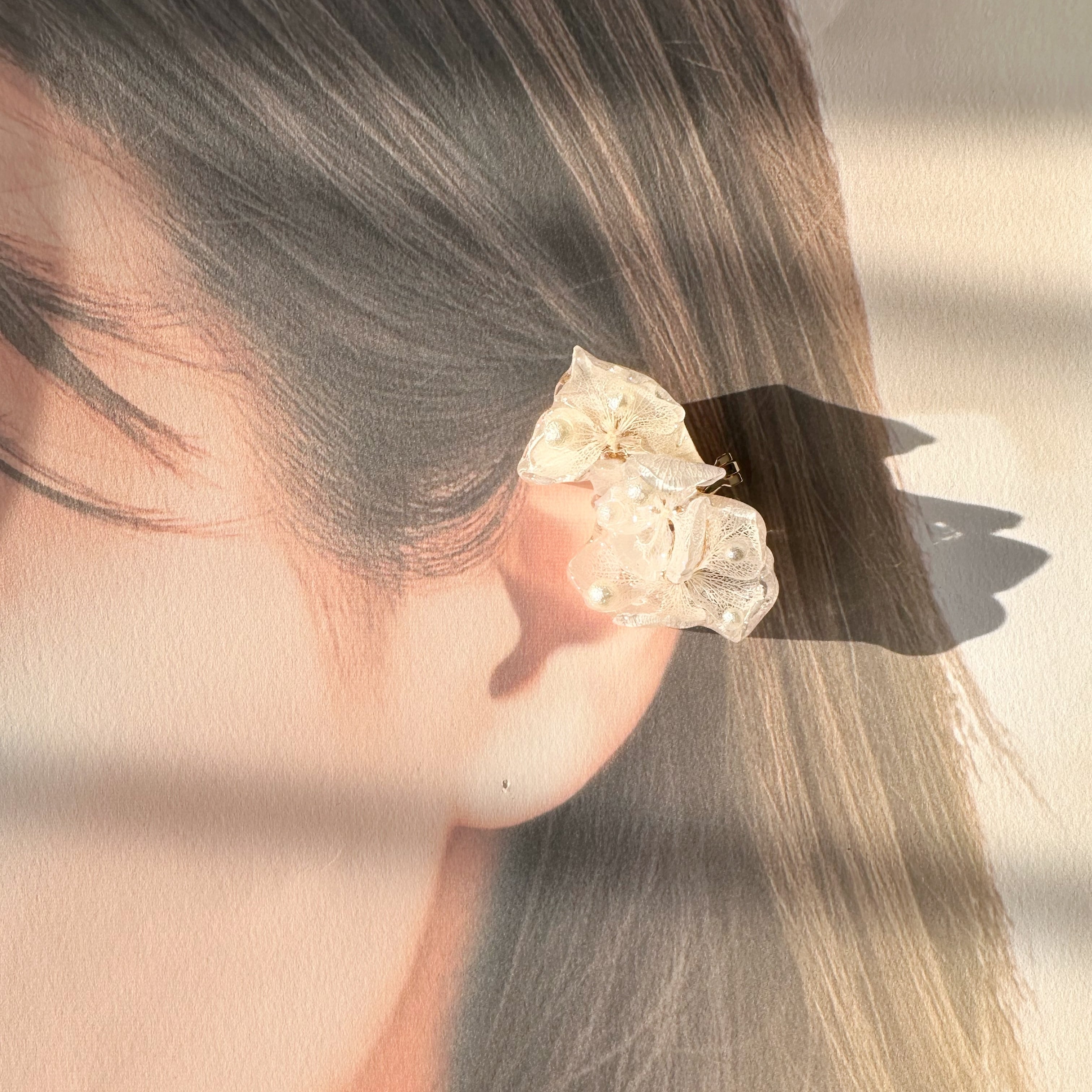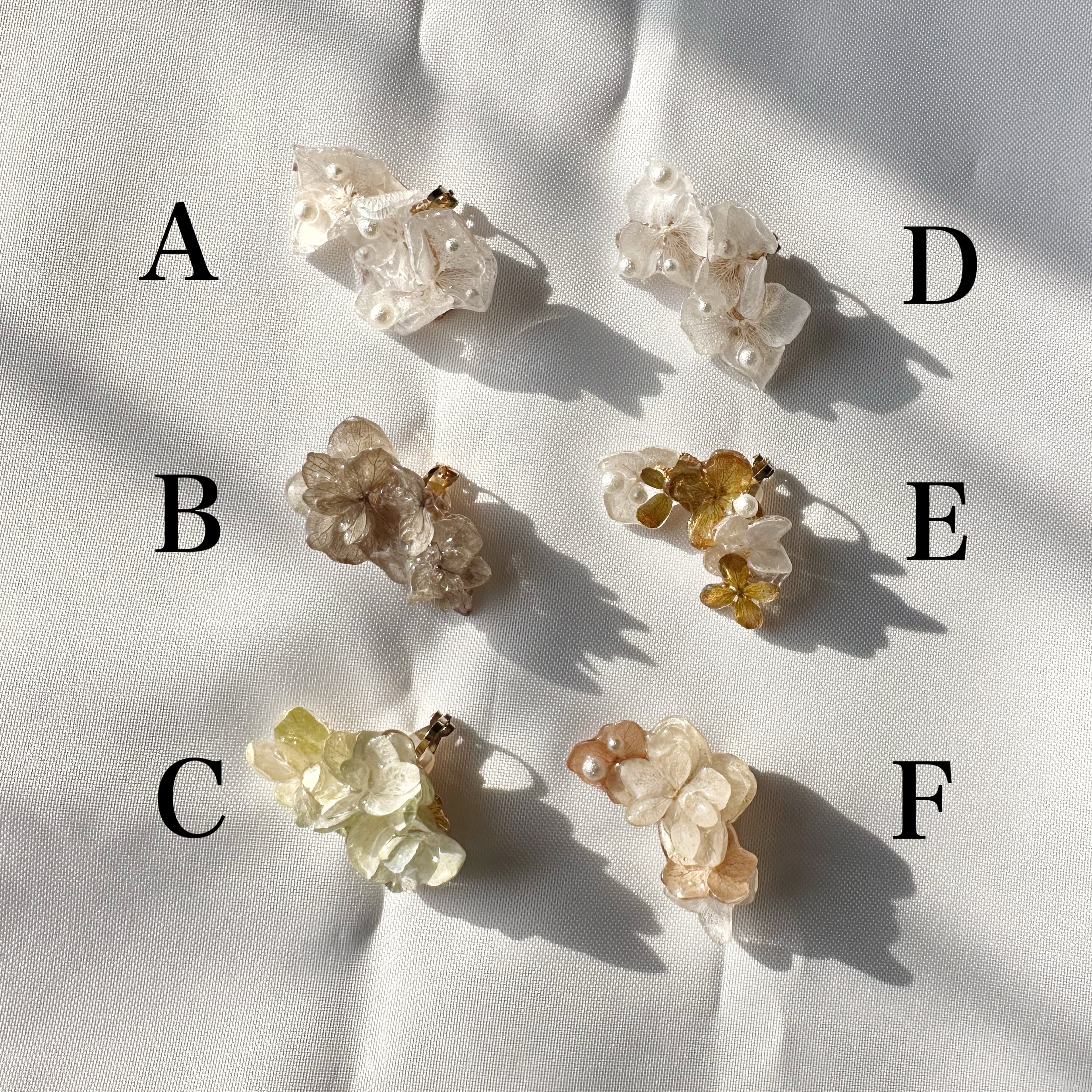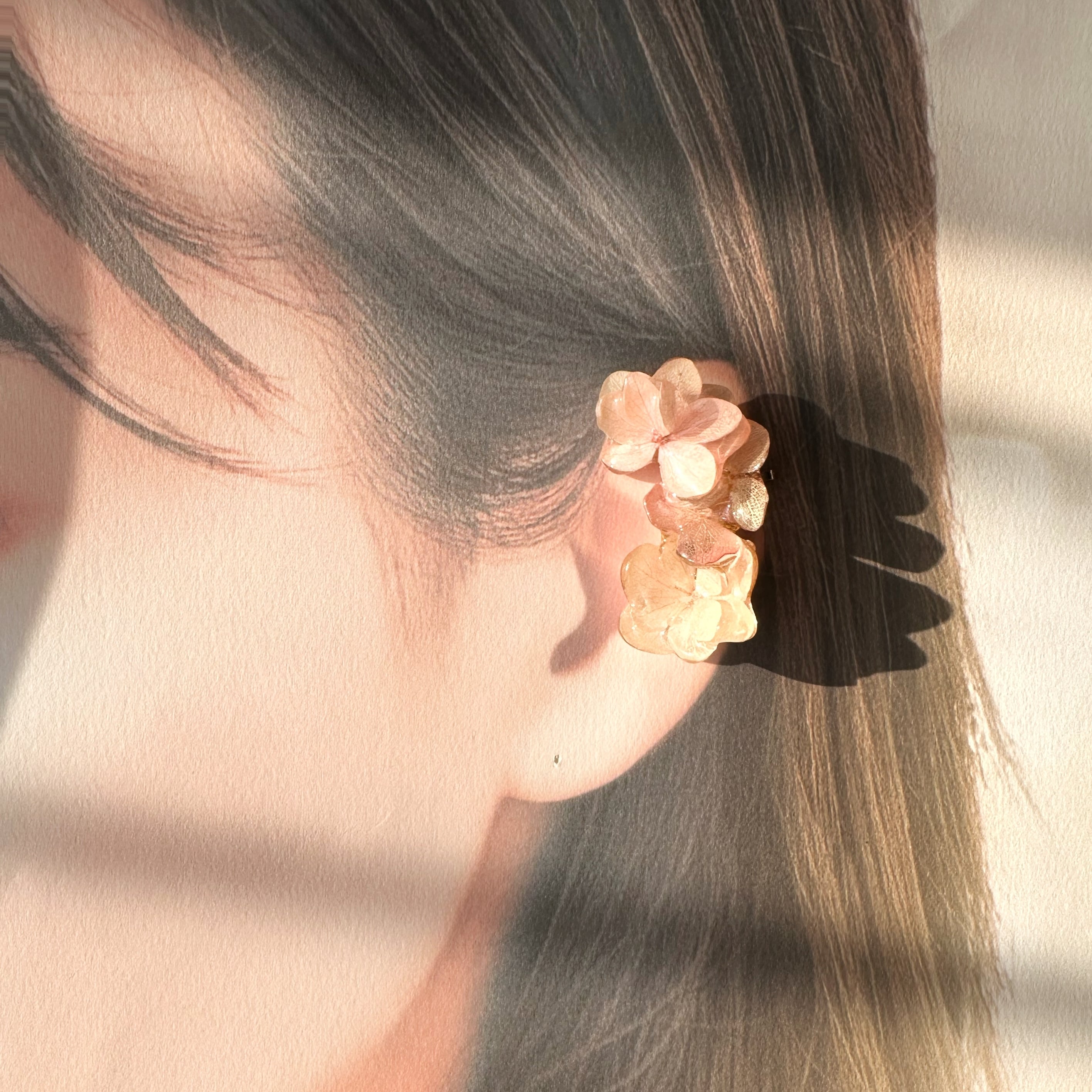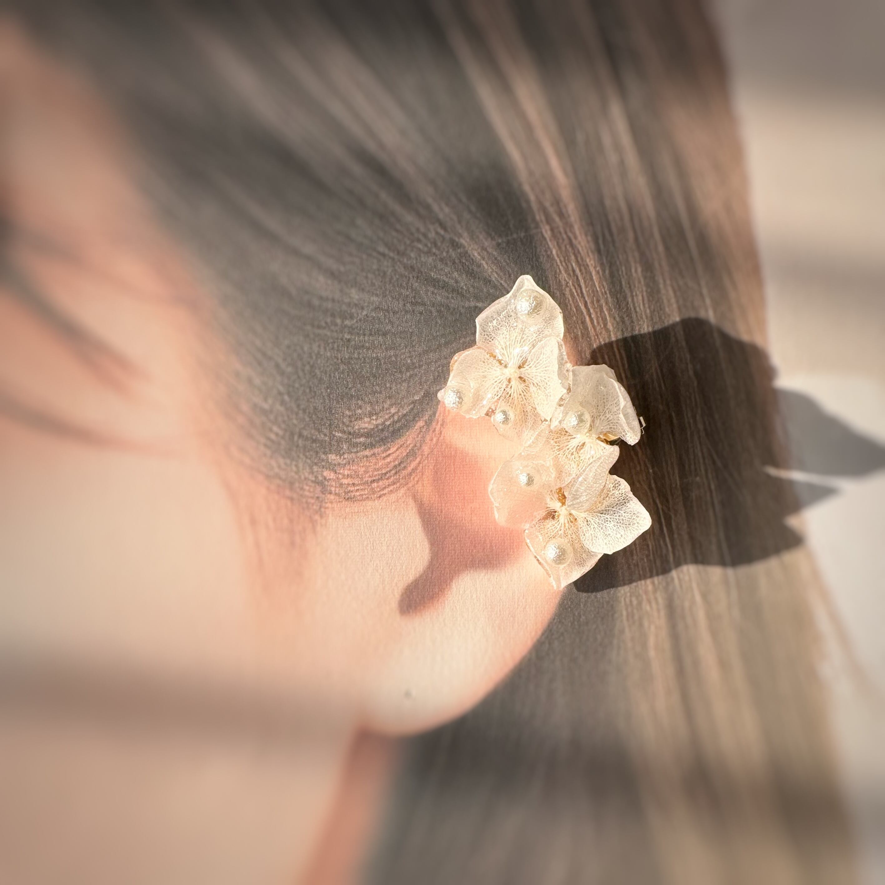 本物の紫陽花の花びらプリザーブドフラワー、レジン、イヤーカフ、透かしパーツ
