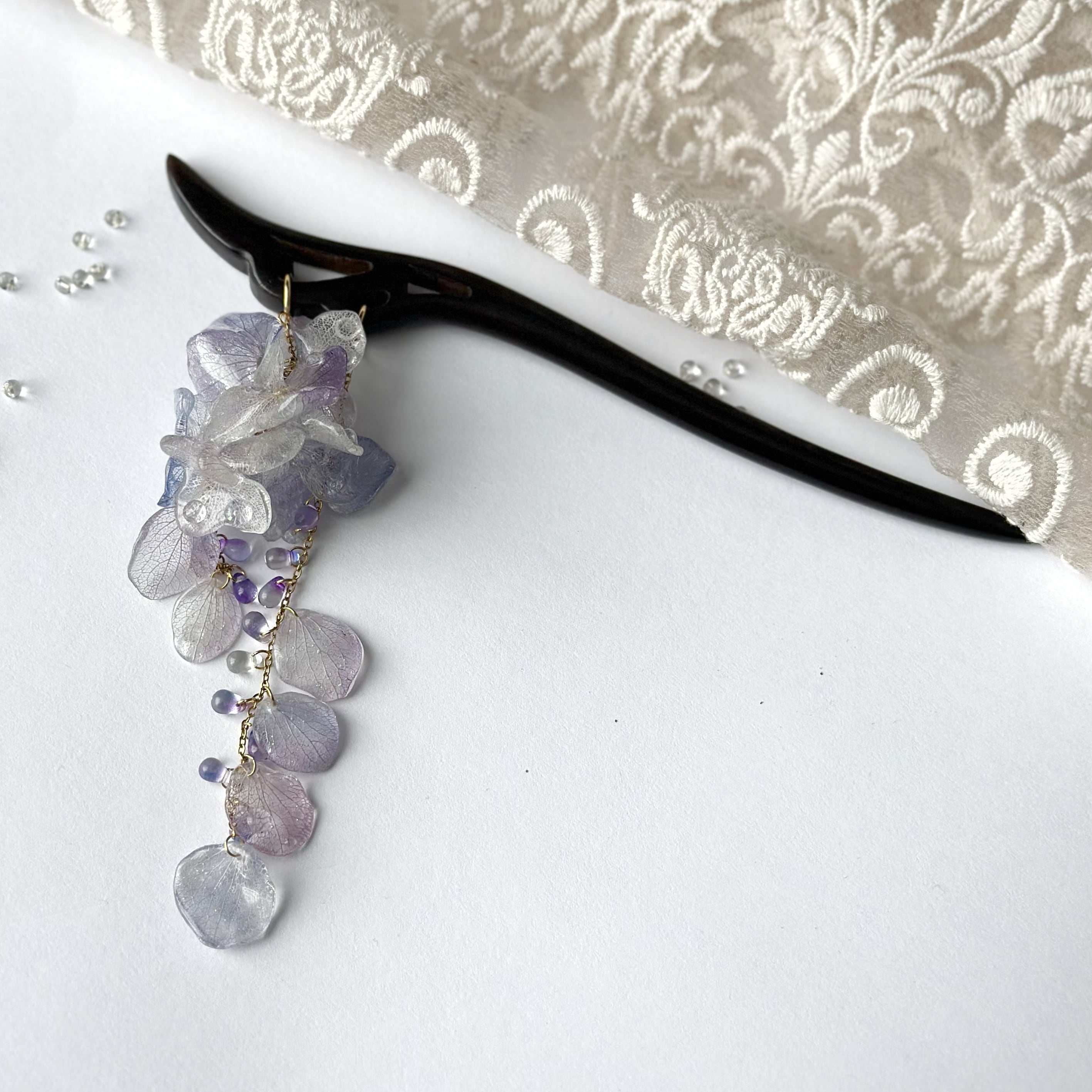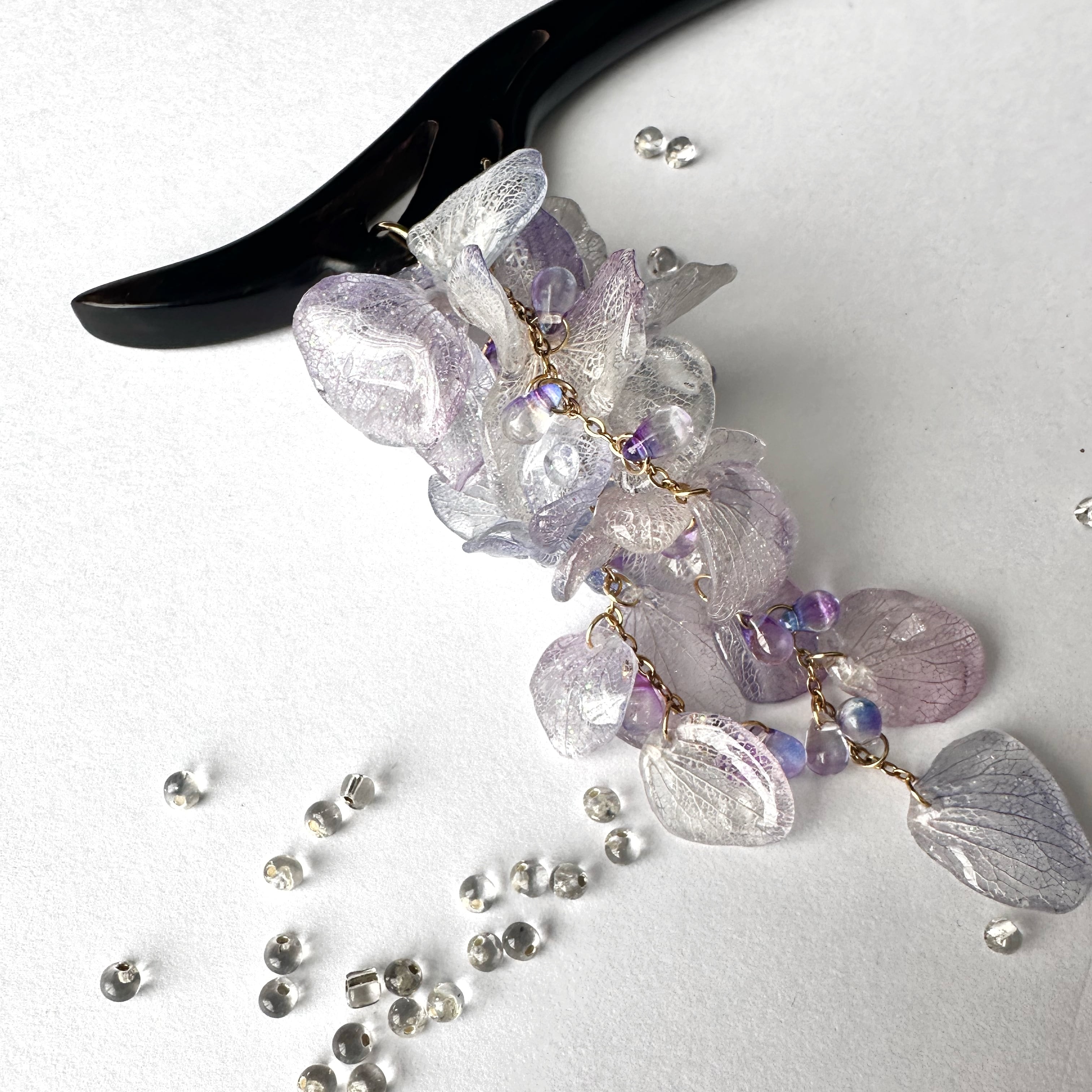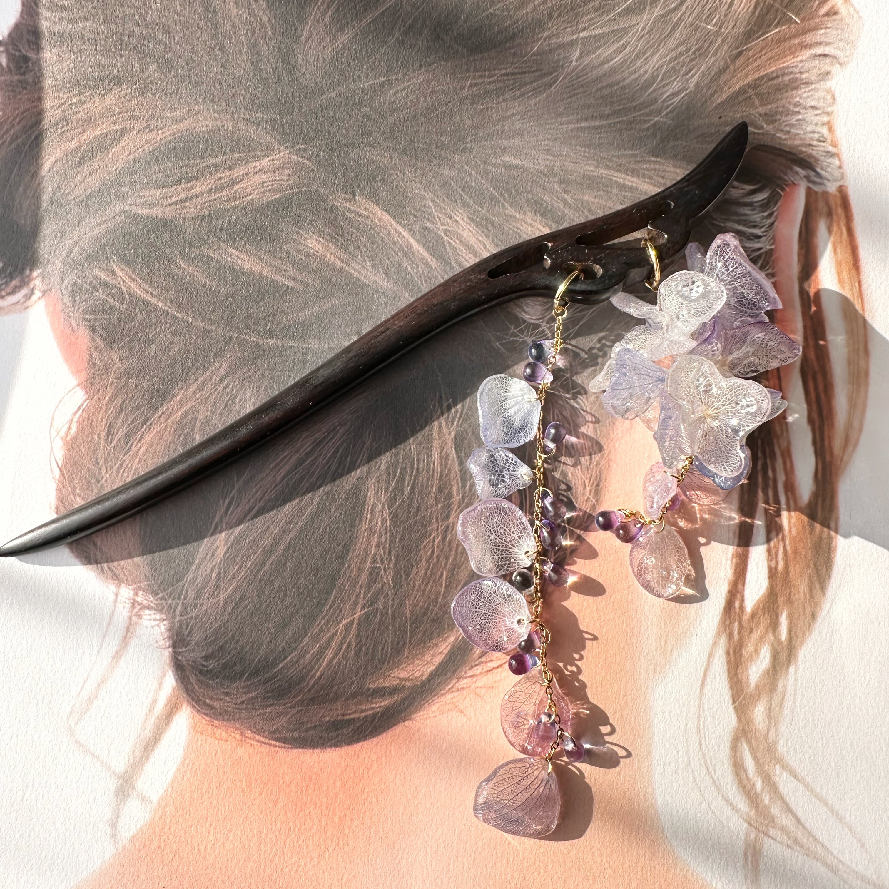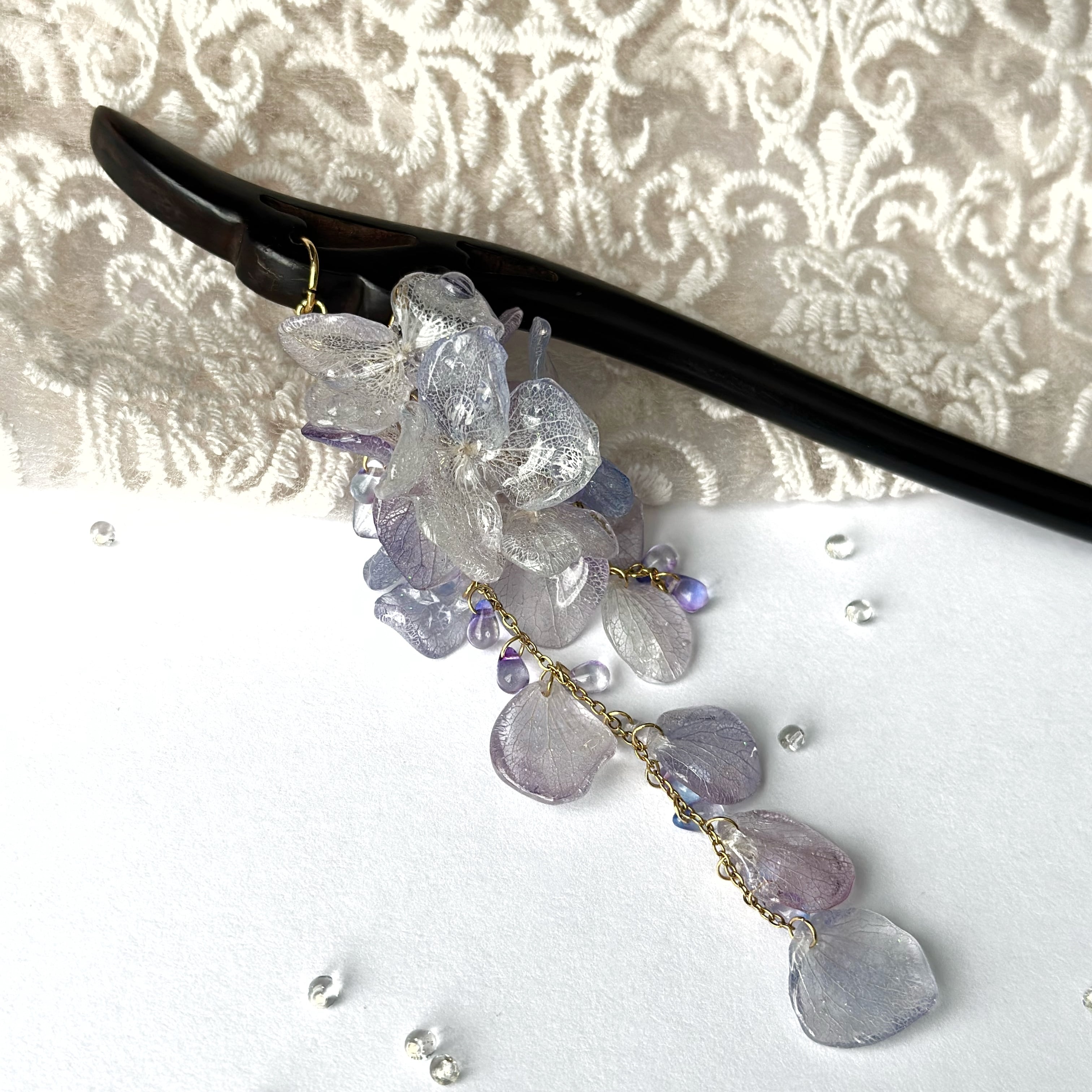 本物の紫陽花プリザーブドフラワー、レジン、丸カン(サージカルステンレス316)チェーン(サージカルステンレス304)チェコビーズ、簪(天然黒壇)1本挿し約18cm