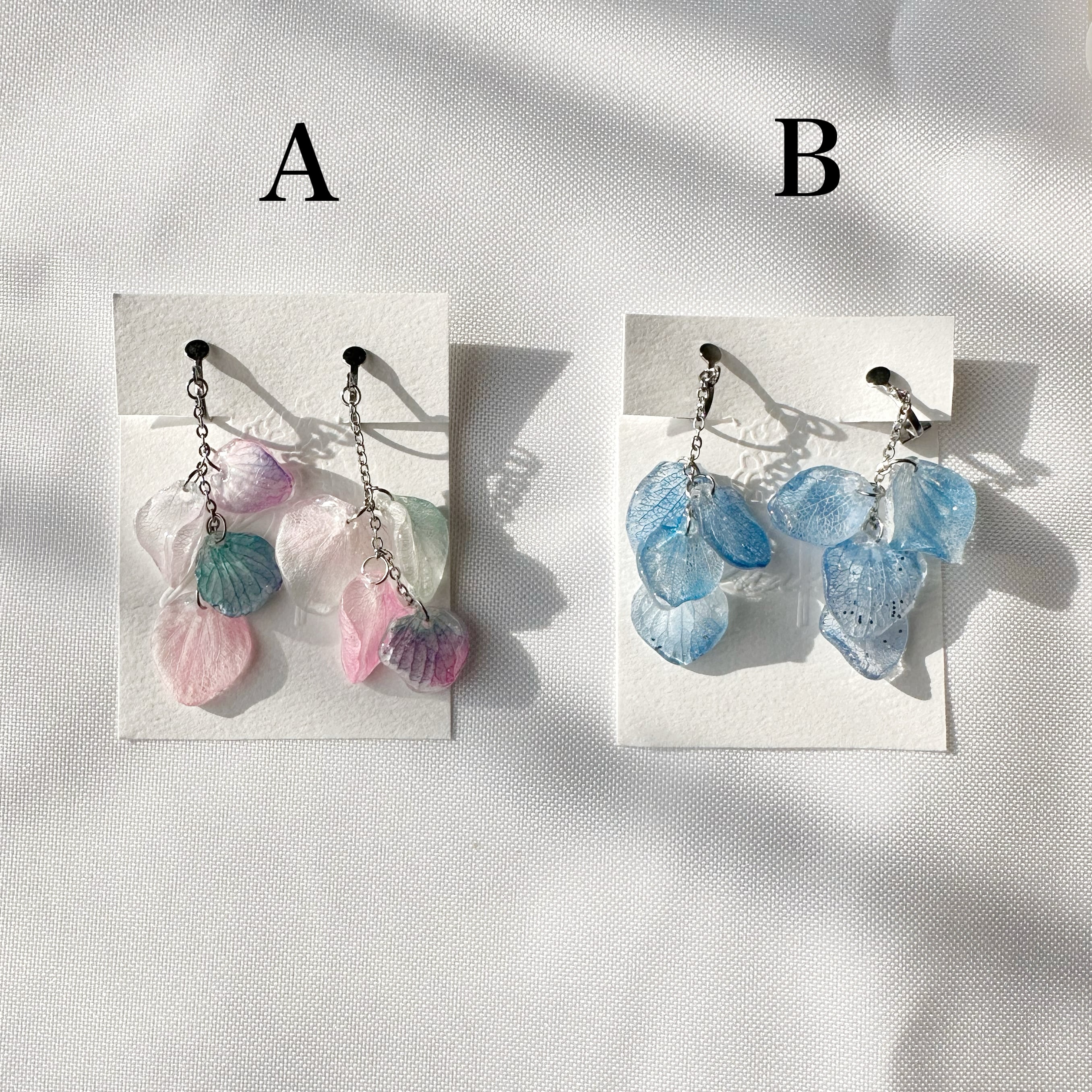 本物の紫陽花プリザーブドフラワーの花びら、レジン、丸カン(サージカルステンレス316)チェーン(サージカルステンレス304)